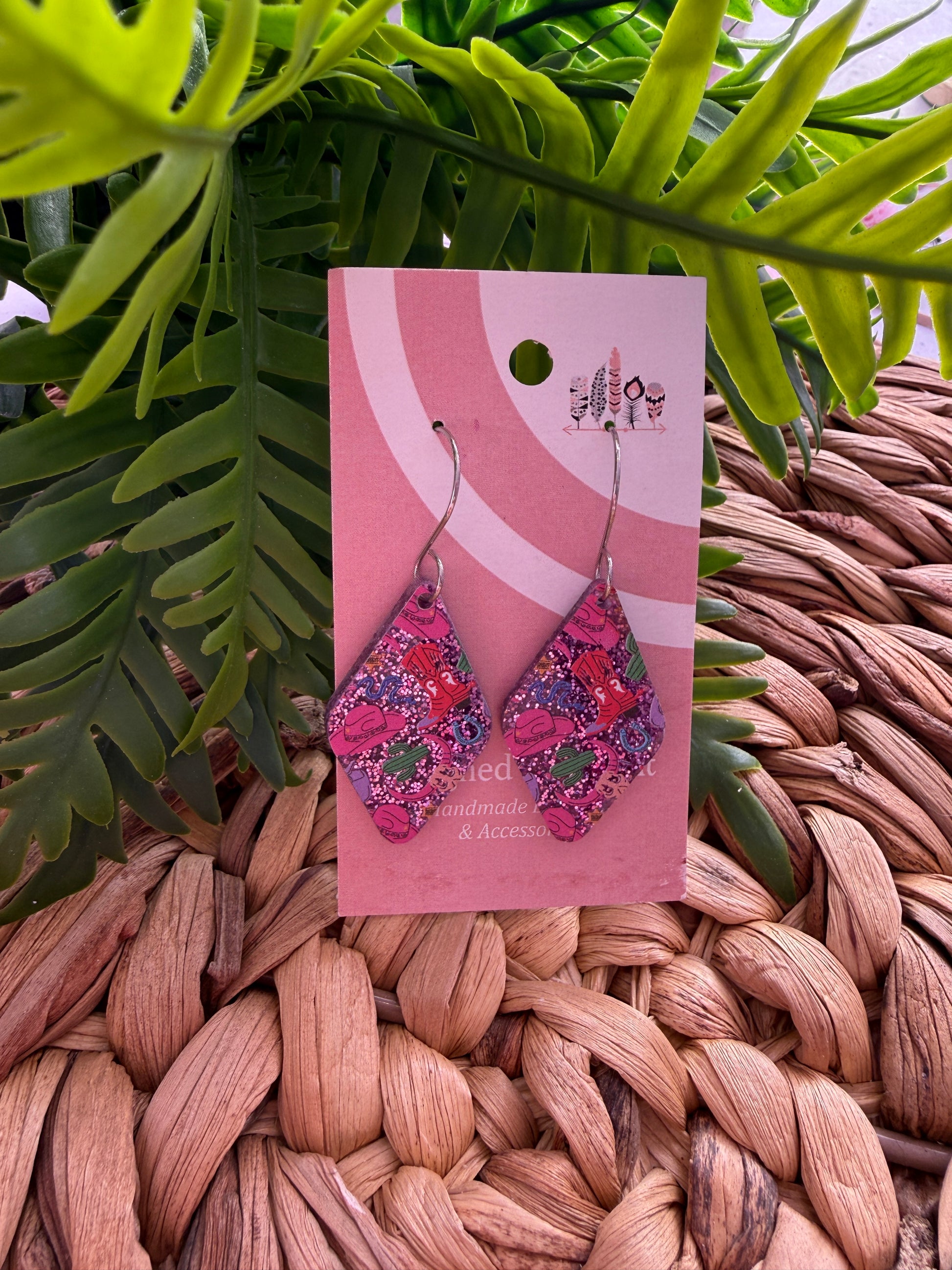 Make a statement with these scattered cowgirl print earrings featuring a playful western-inspired pattern layered over purple glitter. UV printed on a glitter acrylic base, they catch the light beautifully while the scattered design adds movement and personality. Lightweight and comfortable, they’re perfect for concerts, game days, and nights out.