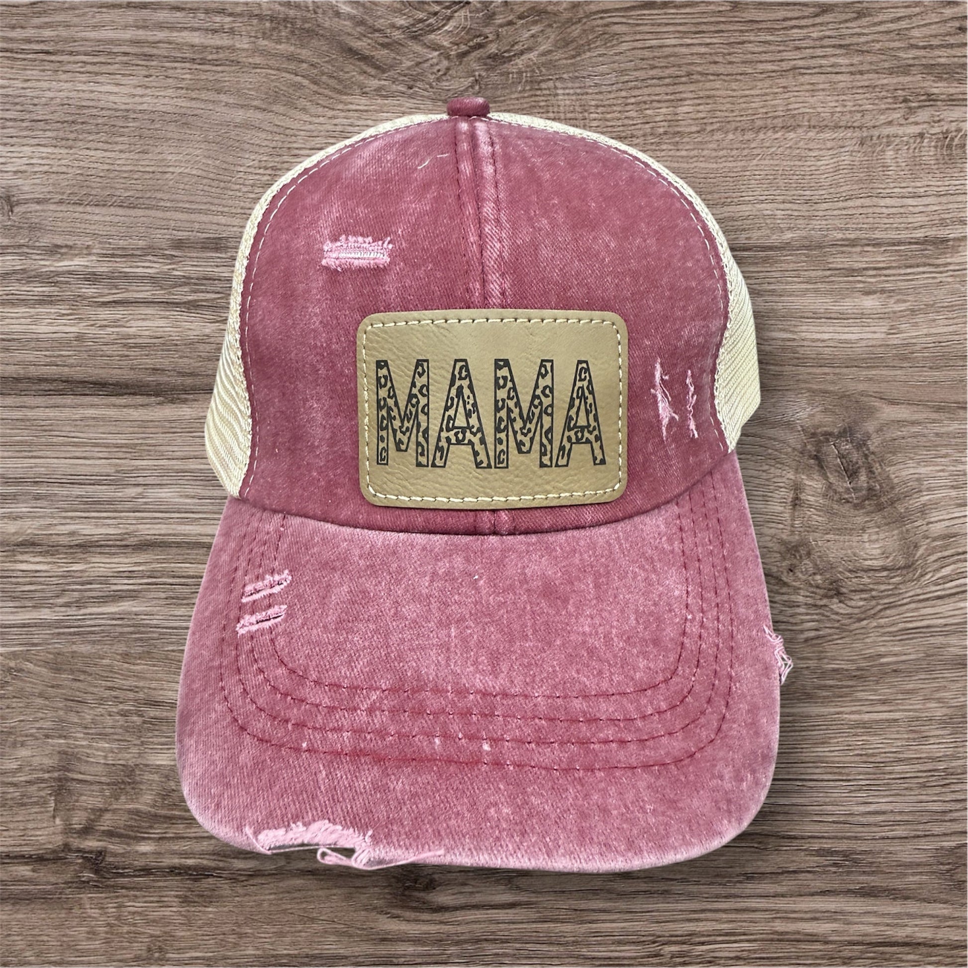 Women's distressed ball cap with criss cross design in the back to wear your ponytail low, middle or high.