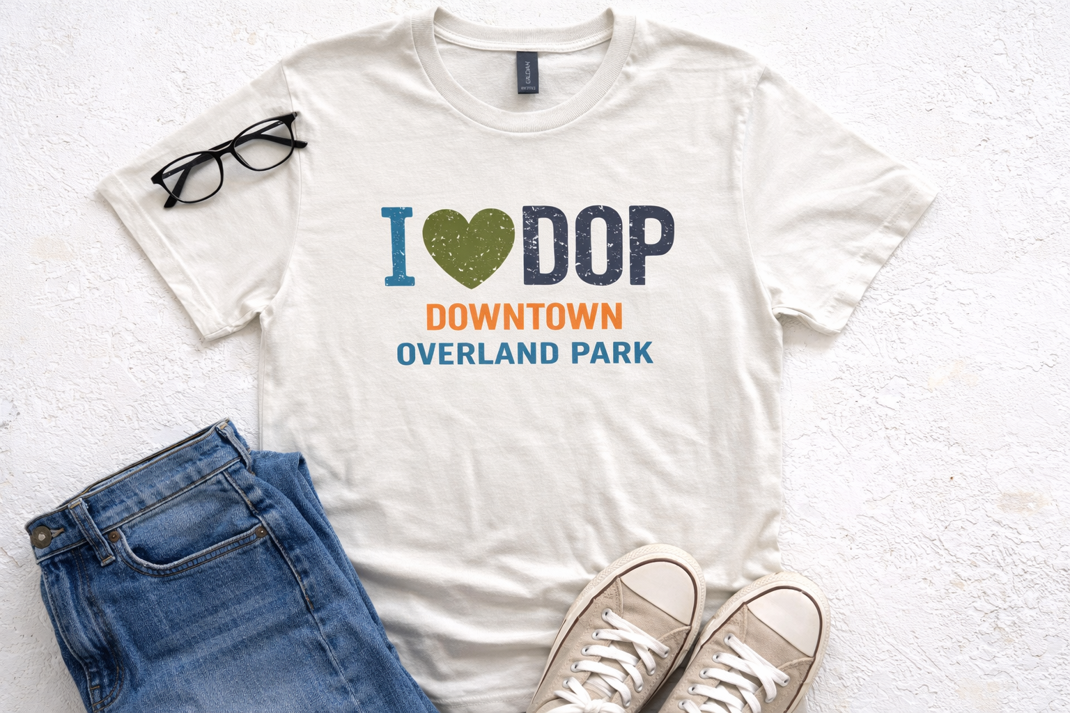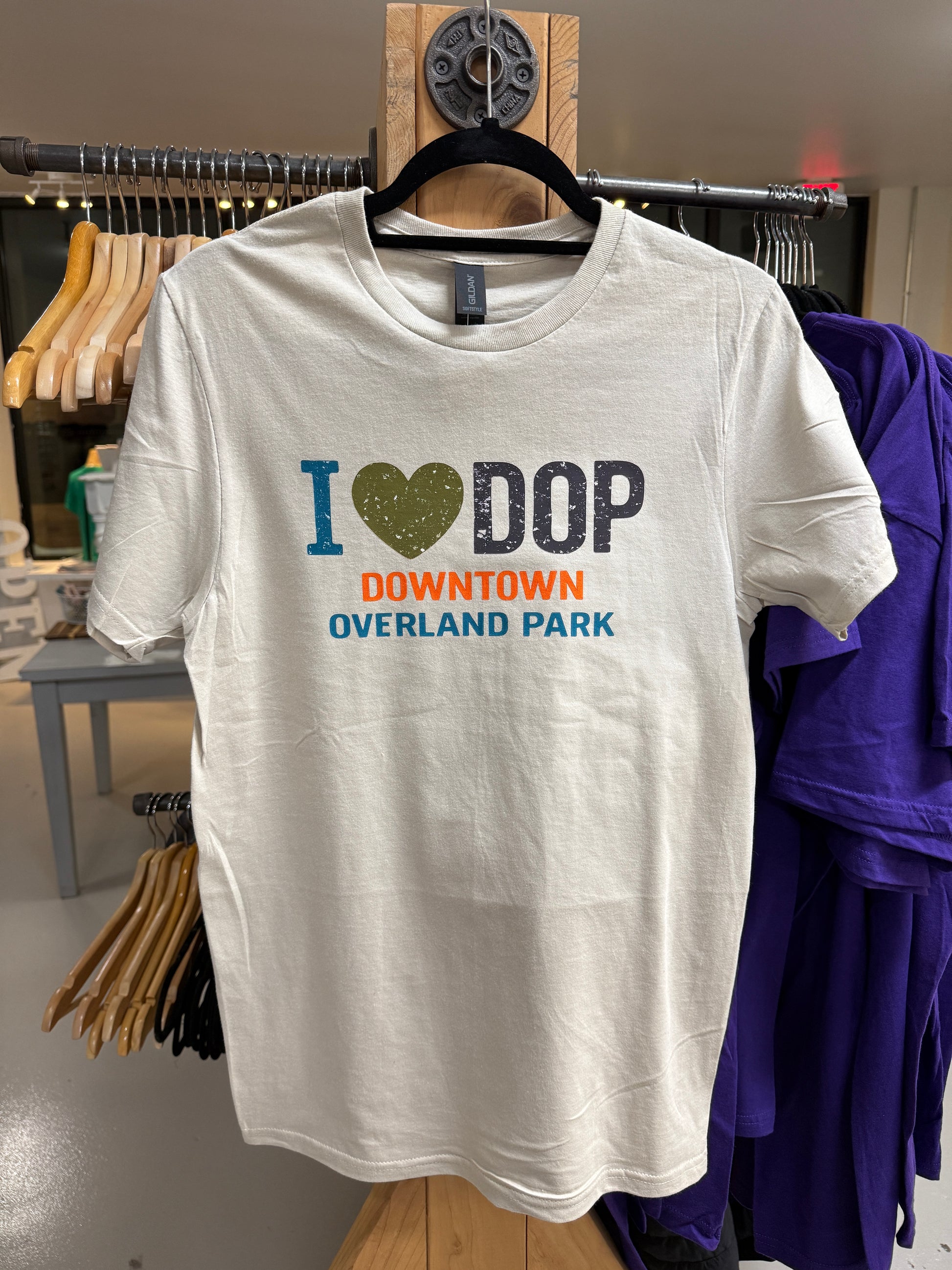 This unisex graphic tee features a bold, distressed “I ♥ DOP” design with layered typography that highlights Downtown Overland Park in standout color. It’s the perfect everyday shirt for market days, local events, coffee runs, and repping your favorite neighborhood wherever you go.