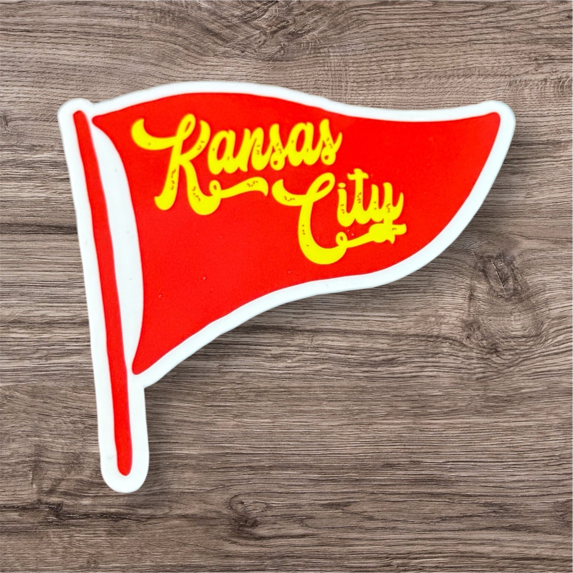 Show your city spirit with the Raise the Pennant Sticker! This playful, waterproof sticker measures 3.25 by 3 inches and features a pennant shape with charming cursive Kansas City text. Perfect for adding a fun, stylish touch to your gear, no matter the weather.