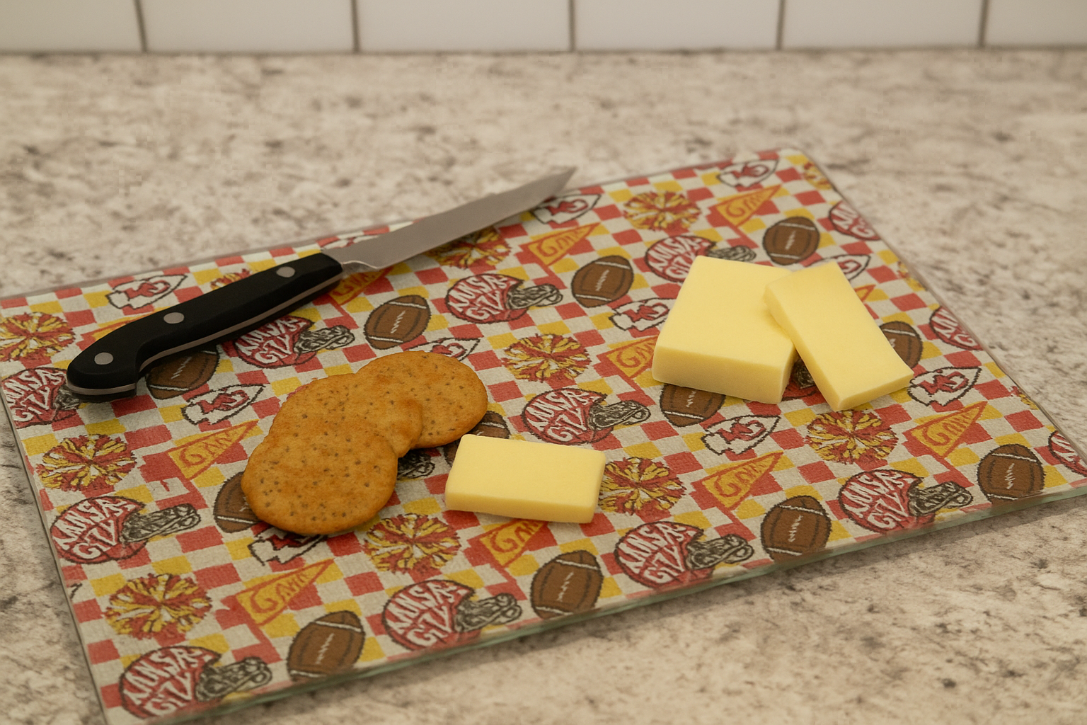 Add a bold game day touch to your kitchen with this Chiefs-inspired scatter print tempered glass cutting board! Perfect for prepping snacks, serving appetizers, or displaying at tailgate parties, this durable board is sublimated with a vibrant scatter print design on the top surface while the back remains sleek and white.