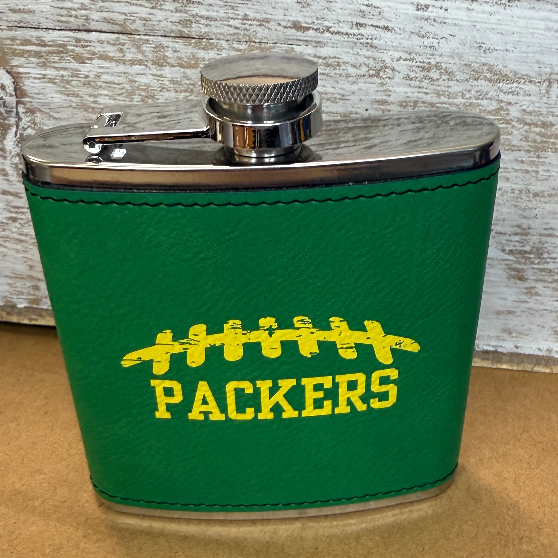 Show your Green Bay pride with this Packers flask, featuring a bold UV printed half-football design on sleek leatherette. Crafted from durable stainless steel, this 6 oz flask is both stylish and functional—perfect for tailgates, game days, or gifting to your favorite fan. Compact and easy to carry, it’s built to keep your spirits high all season long.