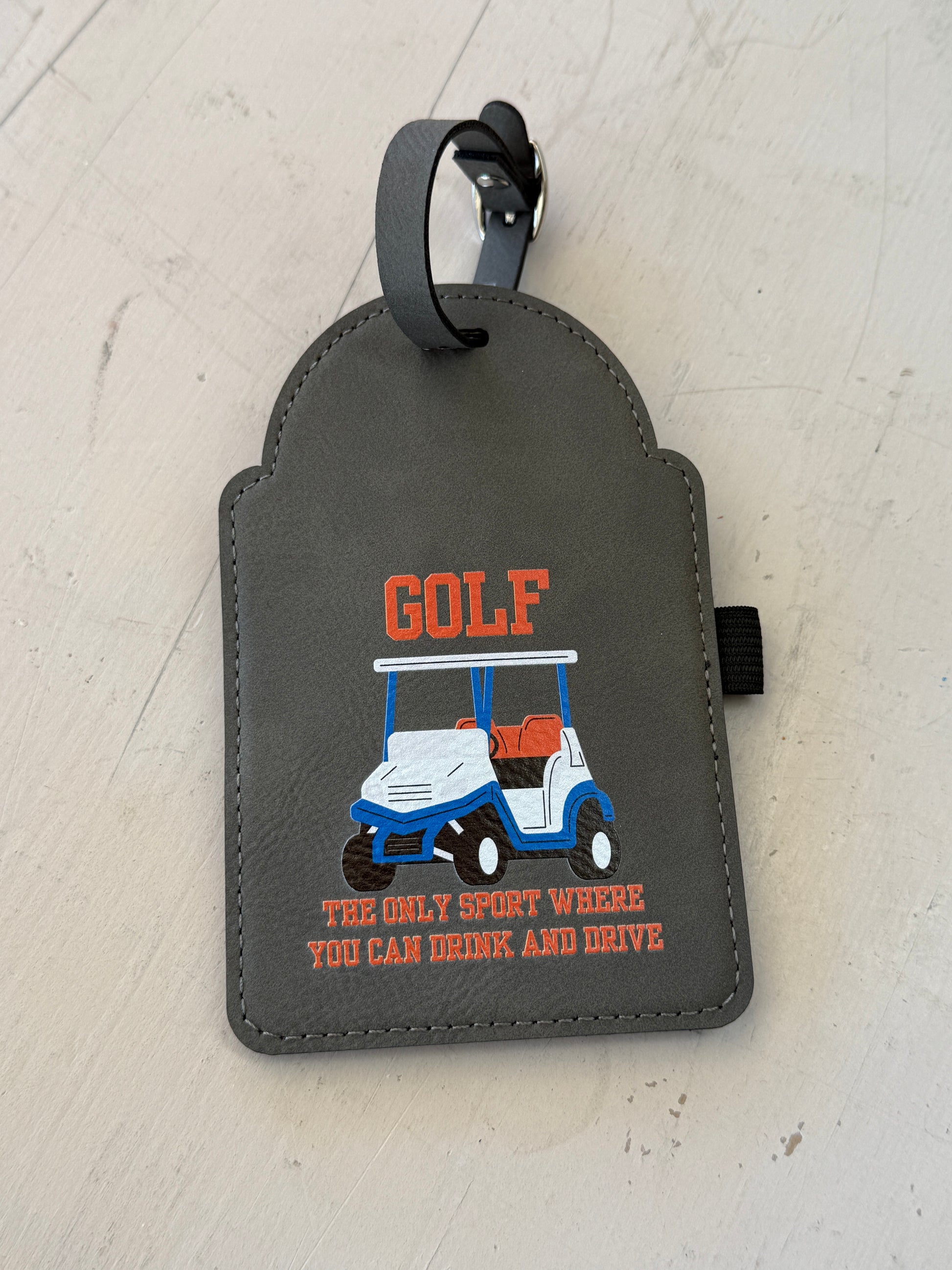 This UV printed leatherette golf bag tag is a must-have for golfers who don’t take themselves too seriously. Featuring a playful golf cart design and the phrase “The only sport where you can drink and drive,” it adds humor and personality to any golf bag while still being functional and durable.