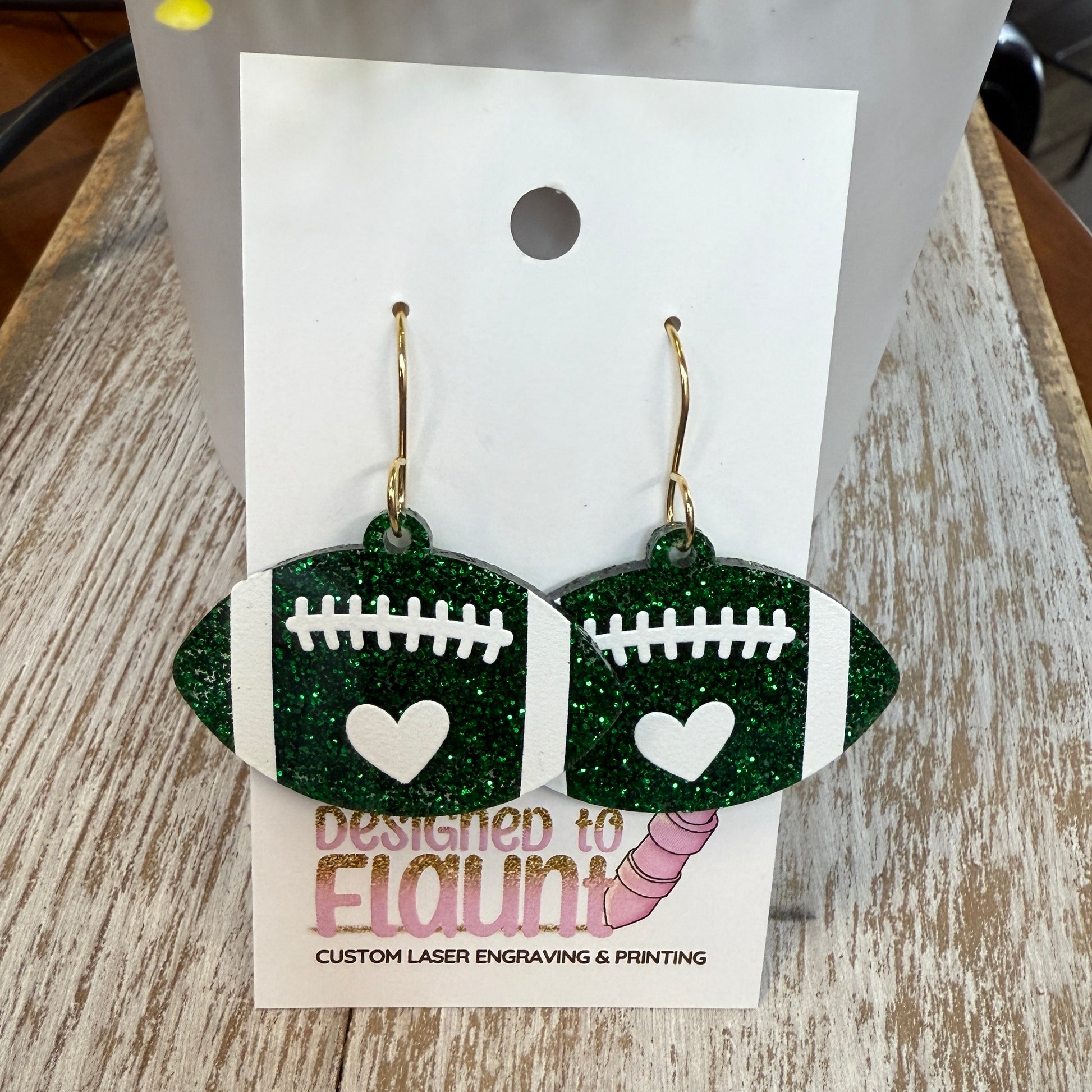 Show your team spirit with these UV printed acrylic football dangle earrings, featuring a heart detail for that extra game day love! Lightweight and comfortable with hypoallergenic hardware, these earrings are perfect for cheering from the stands, tailgating, or everyday wear during football season.