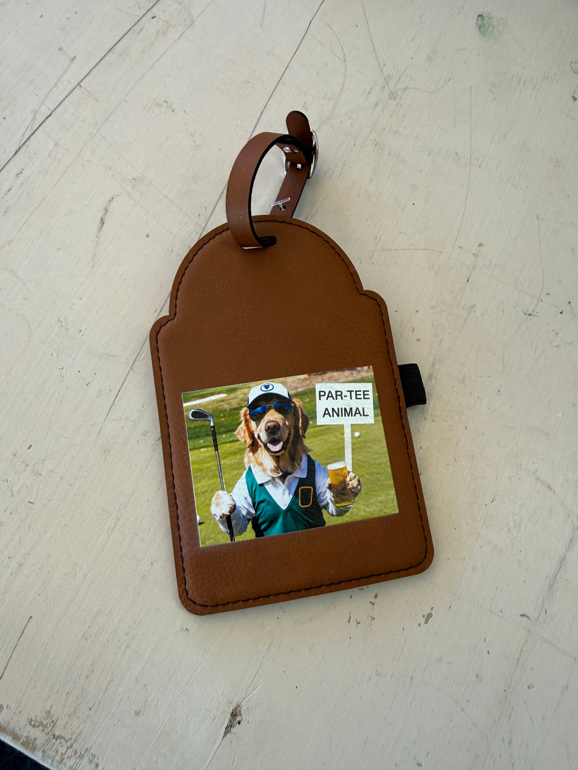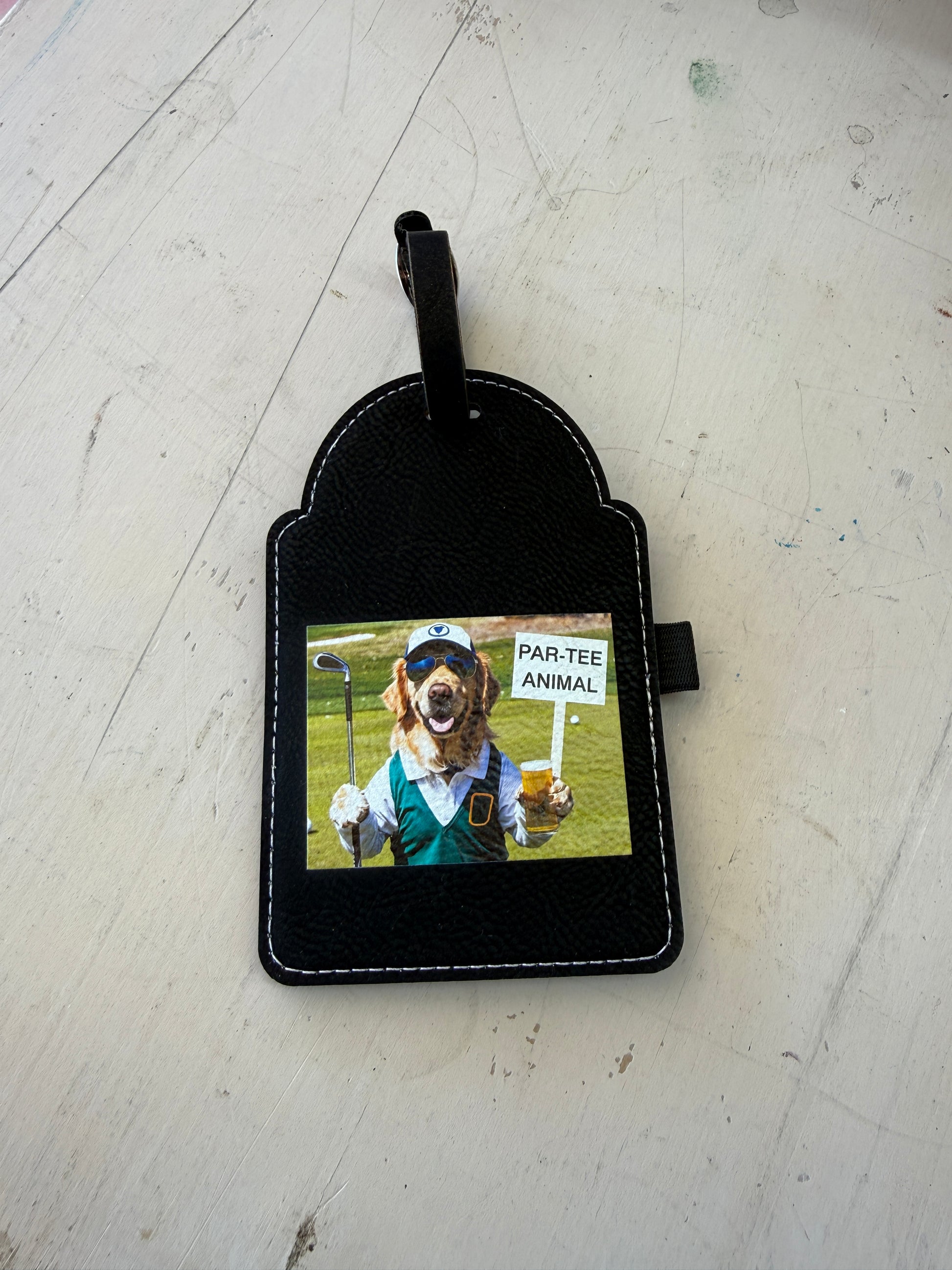 This UV printed leatherette golf bag tag features a fun-loving pup geared up for the course, complete with shades, a club, and a cold drink. Finished with the phrase “Par-Tee Animal,” it’s the perfect accessory for golfers who bring personality (and a little chaos) to every round.