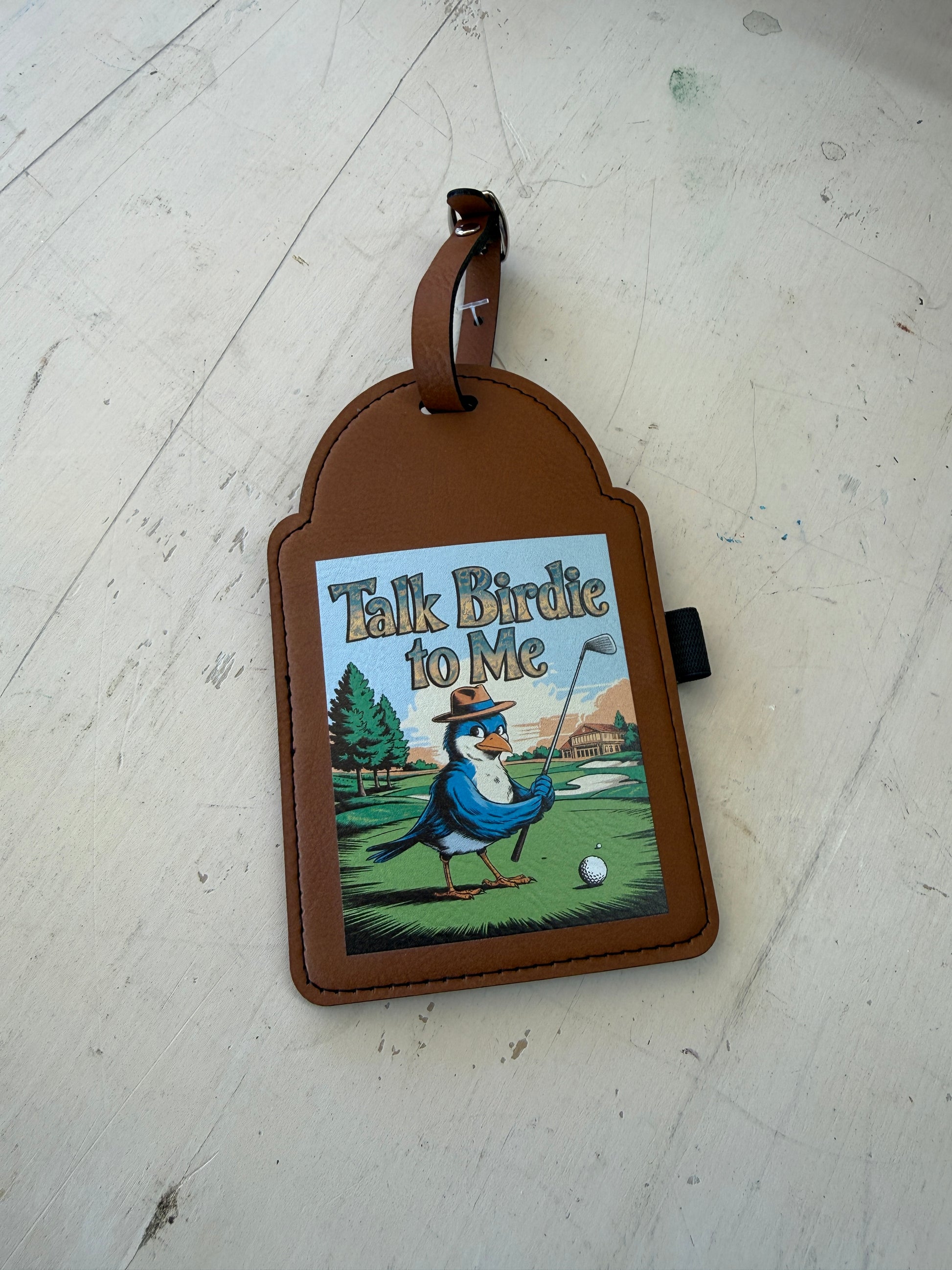 This UV printed leatherette golf bag tag features a charming bird golfer and the phrase “Talk Birdie to Me,” making it the perfect accessory for players chasing low scores and good vibes on the course.